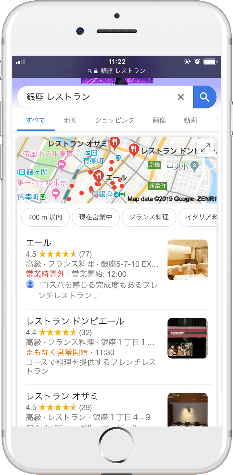 このエリアは、地図上に検索結果に該当する店舗、施設等がポイント表示されるので、目的の場所を訪問しようとしている人に対して、非常に高い見込み効果があります。MEOの施策を行うことにより、このエリアに表示されることが可能になります。